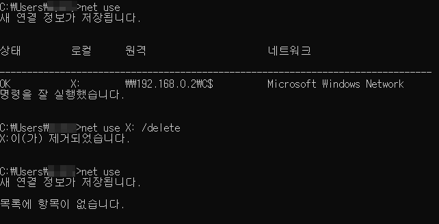 net use x: 192.168.0.2.경로 (192.168.0.2의)User명 Password
