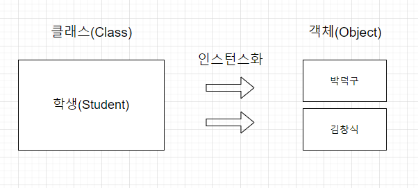 그림으로 표현하면 위와 같다. 학생이라는 클래스(설계도)를 만들고, 박덕구와 김창식이라는 객체를 인스턴스화 시켰다고 할 수 있다. 이 것을 코드화하면 아래와 같습니다.