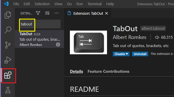 위 링크로 들어가던가, vscode 프로그램에서 extension으로 들어가서 tabout을 입력 후 설치하면 이클립스와 같이 tab으로 코드를 나갈 수 있게 된다.