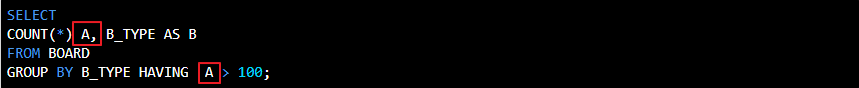 그리고 SELECT 절에서 사용한 별칭은 HAVING절이나, WHERE절에 사용할 수 없음.