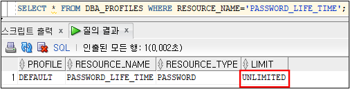 데이터베이스 일반계정으로 접속하려고 하니 패스워드가 만료 났다고 한다. ORA-28001 에러! ADMIN(sys as sysdba) 계정으로 접속 후 아래 쿼리를 실행해줬다.