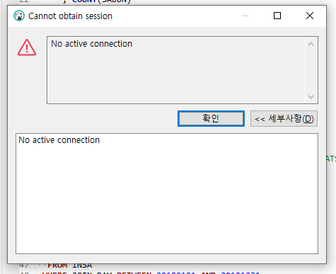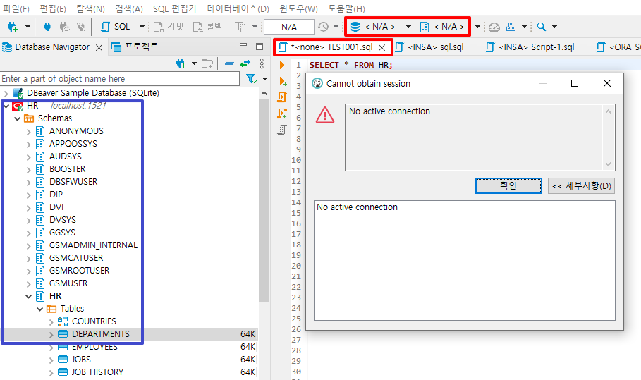 DBeaver 툴을 사용중 갑자기 No active connection 라는 에러를 만났다.