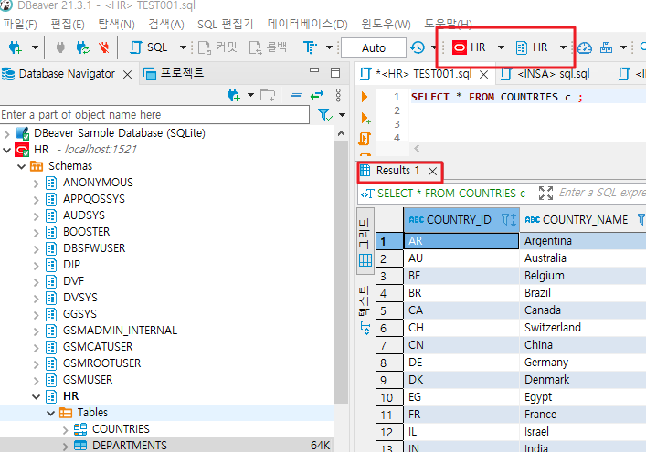 예를 들어 HR이라는 데이터베이스를 사용하고 싶고, 그 안의 스키마중 HR스키마 안의 COUNTRIES 테이블을 사용하고 싶으면!