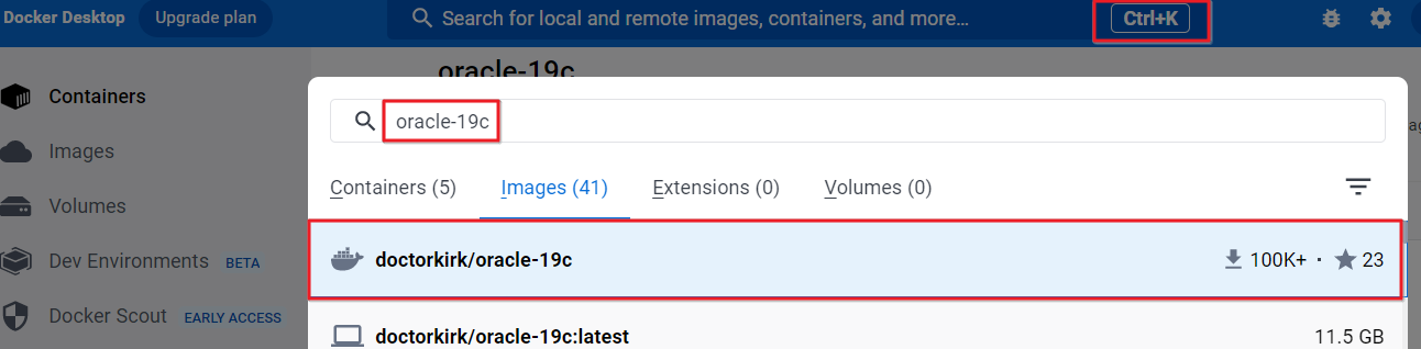 도커 다운로드 후 실행하고 Ctrl + k를 눌러주고 oracle-19c를 적어주면 가장 많이 다운받은 오라클에서 제공하는 이미지가 있다 해당 이미지를 pull로 당겨오자!
