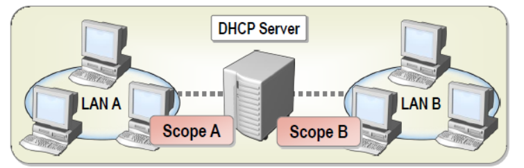 Scope(범위)란 DHCP 서비스를 사용하는 서브넷에서 관리 목적을 위해 컴퓨터의 IP addresses 그룹으로 묶은 것입니다