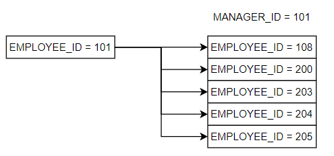 A테이블 조건으로 EMPLOYEE_ID가 101 대상하나와 B테이블의 B.MANAGER_ID와 A.EMPLOYEE_ID가 101 인 대상을 조인처리 하였다. 그림으로는 위와 같다.