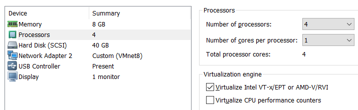 Custom VMnet8(NAT)를 설정해줍니다. 서버나 클라이언트에 연동하기위해서 VM1번이나 2번등 추가 해주시면 실습하는데 좋습니다. 그리고 가장 중요한 Virtualization engine에서 Intel VT-x/EPT or AMD-v/RVI을 클릭해줍니다.