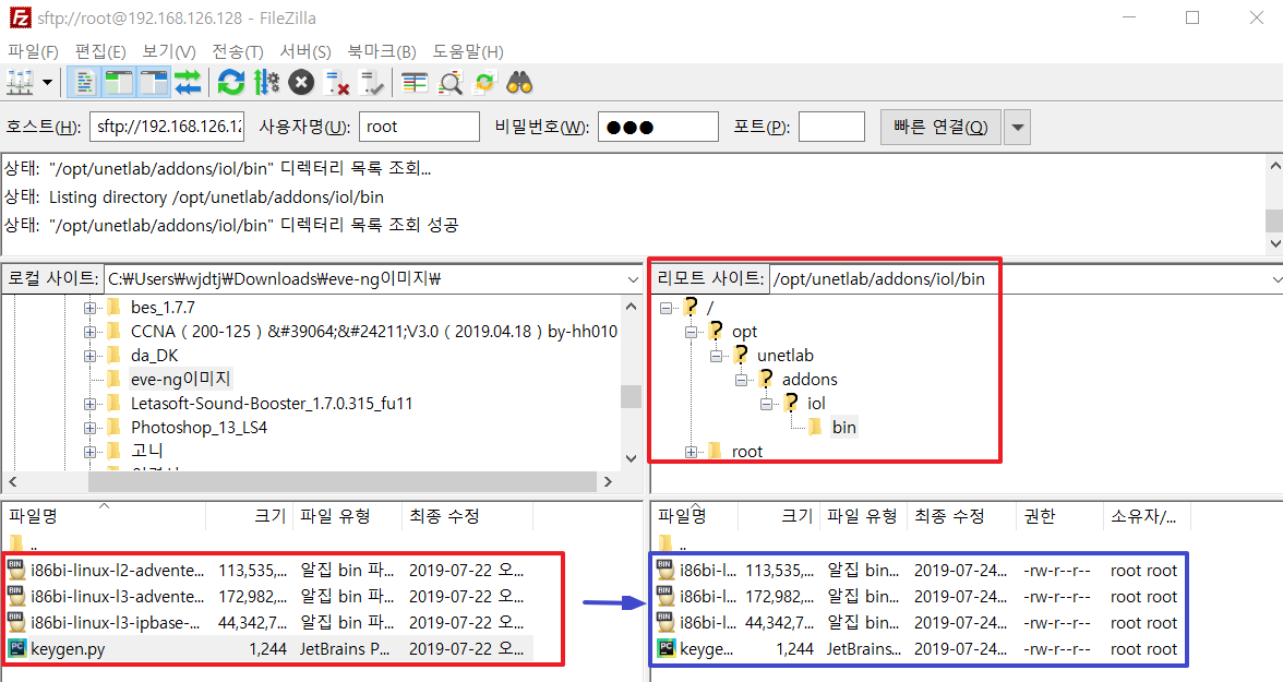 /opt/unetlab/addons/iol/bin 으로 경로를 이동해주고 /opt/unetlab/addons/iol/bin경로로 IOU파일과 스크립트 파일을 옮겨줍니다.