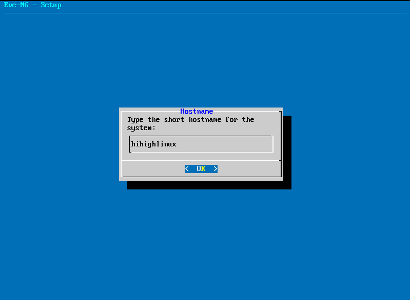 호스트네임 설정화면입니다. 자신이 원하는 호스트네임을 설정해줍시다. 저는 hihighlinux를 입력해줬습니다.