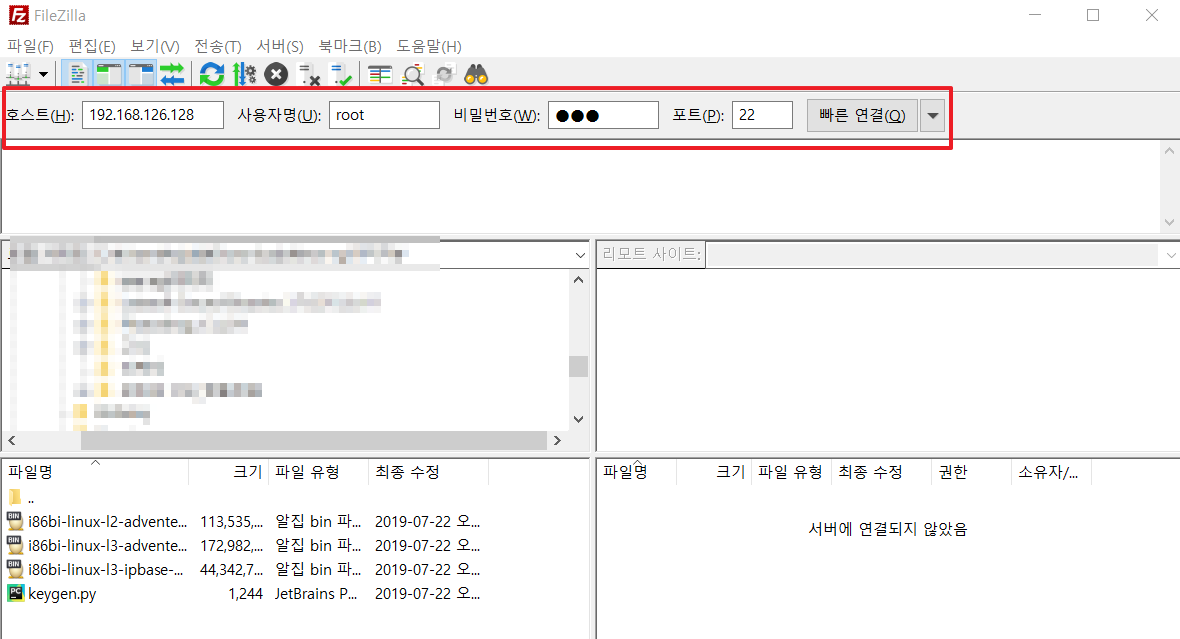 로그인 완료후 다운로드 받은 파일질라를 실행 시켜줍니다.