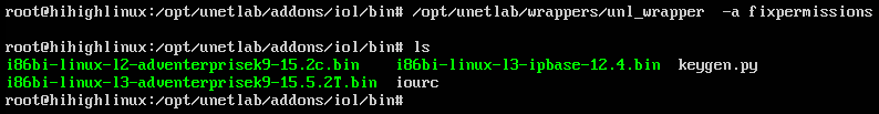 그리고 /opt/unetlab/wrappers/unl_wrapper -a fixpermissions를 적어주면 아래 IOU파일들이 초록색으로 표시된 것을 확인할 수 있습니다. 권한을 변경해주는 작업입니다