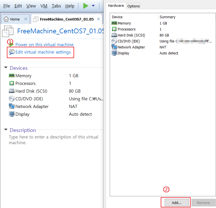 Edit virtual machine을 눌러서 하드디스크 추가를 해주세요