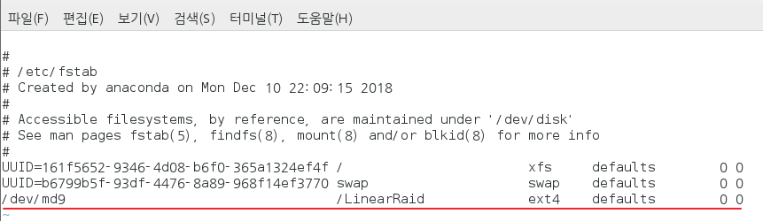 [root@localhost ~]# mkdir /LinearRaid vi편집기로 들어가서 맨밑에 아래 사진과 같이 /dev/md9 과 마운트포인트 파일시스템 등 적어주면 됩니다. |